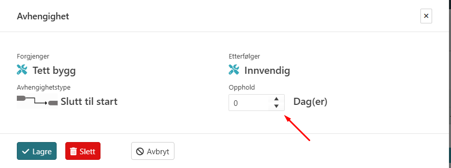 Hvis du benytter presis modus defineres dette på avhengighetsnivå. Når du klikker på en avhengighet får du opp et lite vindu hvor du kan angi hvor mange dagers opphold du ønsker, her kan du skrive positive og negative tall. Skriv inn ønsket antall dager og klikk lagre, planen vil oppdatere seg automatisk.