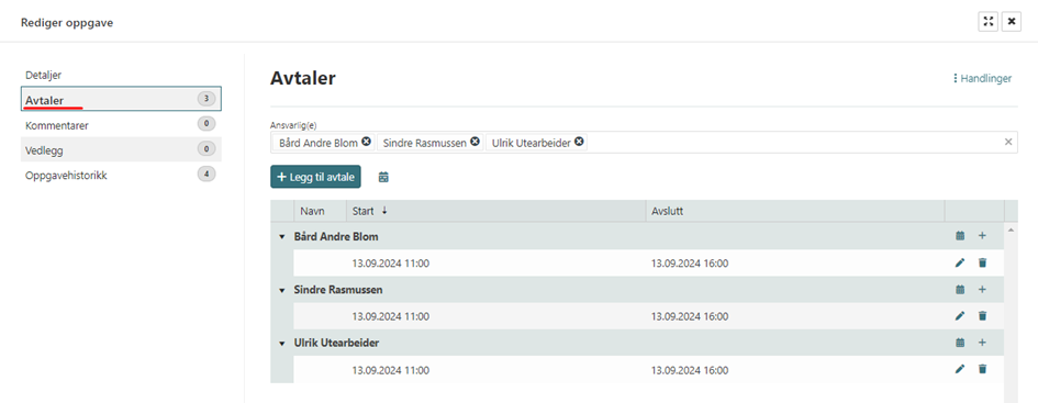 På en oppgave med flere ansvarlige er det ikke alltid alle ansvarlige jobber med denne oppgaven i hele oppgaveperioden, med avtaler får du muligheten til å dele opp slik at f.eks ansatt 1 jobber med oppgaven på mandag, ansatt 2 jobber tirsdag -> torsdag også jobber ansatt 1 igjen på fredagen. Hvis du bare oppretter en oppgave fra mandag til fredag og setter begge ansatte som ansvarlig vil det se ut som begge disse er opptatt mandag -> fredag, selv om det ikke er realiteten.