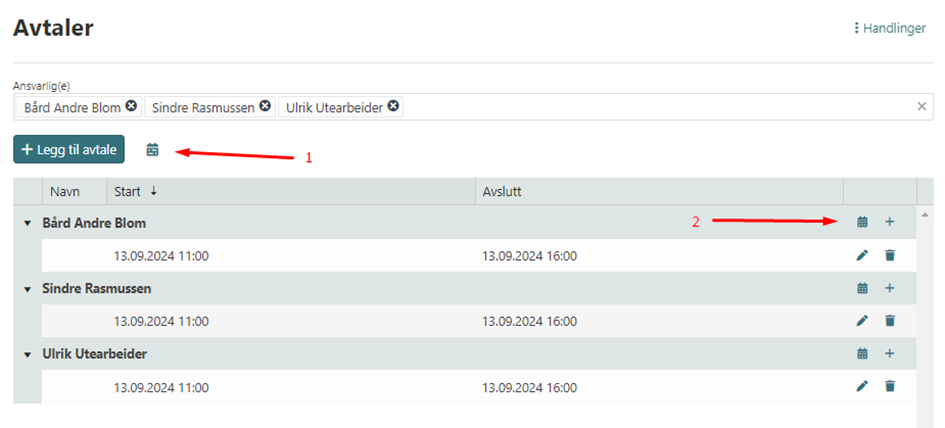 En for alle ansvarlige (1) og en personlig kalender (2), fra den personlige kalenderen kan du enkelt navigere til kalenderen for de andre ansvarlige. I begge disse kalenderene har du samme funksjonalitet som du har i ressursplanleggeren hva gjelder flytting og navigering. Du kan også enkelt opprette flere avtaler til denne oppgaven herfra.