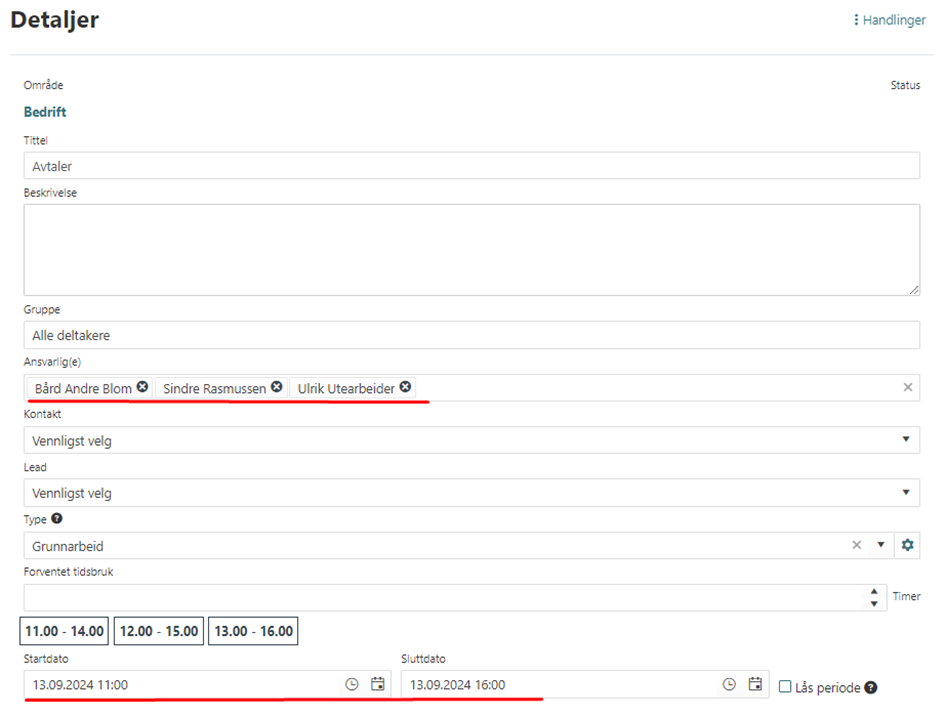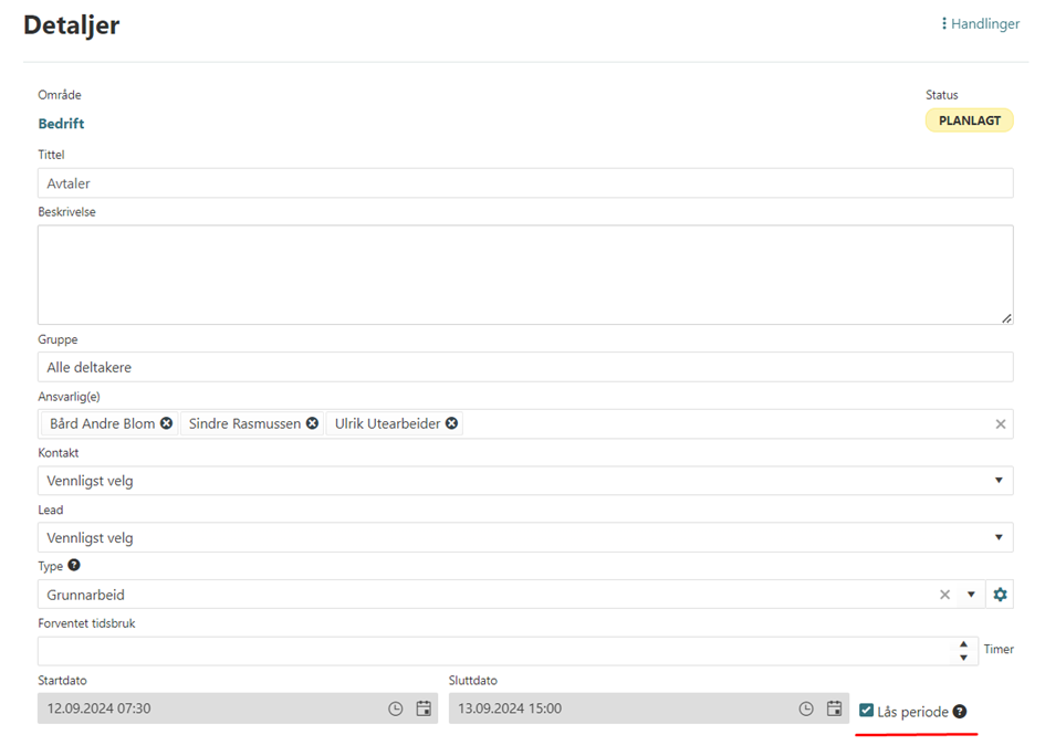 Hvis du ikke ønsker at logikken som er nevnt over skal endre på oppgaveperioden din finnes det en funksjon som lar deg låse perioden, ved å låse start og stopp tiden på en oppgave kan du opprette avtaler innenfor angitt start/stopp av oppgaven uten at tiden på oppgaven endres. Det er heller ikke mulig å opprette avtaler utenfor angitt tidsperiode.