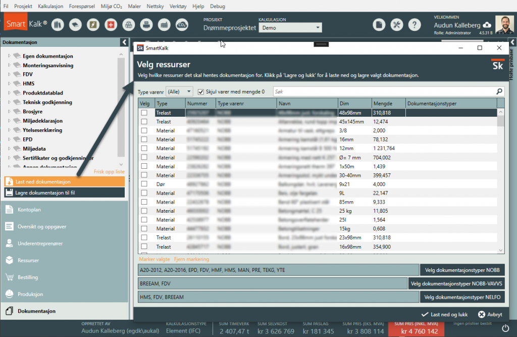 Dersom du har lisens på dokumentasjonsmodulen kan du hente ned dokumentasjon automatisk fra NOBB, som f.eks. FDV dokumentasjon. Dette baserer seg naturlig nok på at du har NOBB, NOBB-VAVVS og EFO-nummere. For å hente dokumentasjon klikk på knappen ‘Last ned dokumentasjon’, som vist under. Du må nå ta stilling til hvilke ressurser\varer du skal hente dokumentasjon for. Vi anbefaler at du er litt kritisk til hvilke varer du henter dokumentasjon for. Kanskje trenger du ikke å hente FDV dokumentasjon for spikeren eller stenderen? For å kunne merke de varene som du ønsker å hente dokumentasjon for kan du bruke søkefeltet. Søker du for eksempel på festemiddel så vil kun festemiddel vises i listen og du kan velge å ta bort haken i kolonnen velg dersom du tidligere har merket alle.
