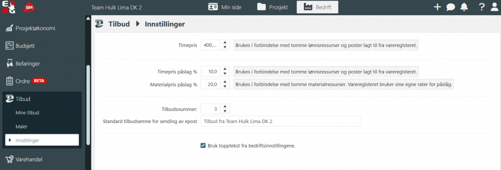 Under innstillinger finnes det muligheter for å sette timepris som en standard verdi. Denne kan likevel endres pr tilbud som lages, via en manuell justering. Hensikten med standard timesats er at tilbudslinjer som inneholder både materiell og timeverk, har raskere utregning.