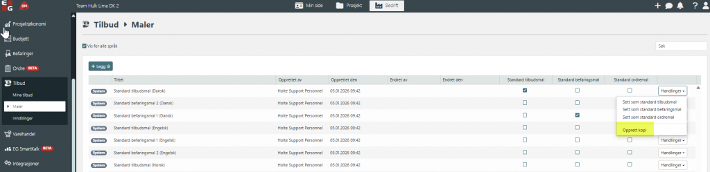 EG Holte leverer system tilbudsmaler klart til bruk. Har du likevel behov for å tilpasse til eget bruk, anbefaler vi funksjonen som ligger under handlinger, opprett kopi. Ved å lage en kopi, kan både tekst og innhold endres. Malene vil kunne benyttes under tilbudsgenerering.