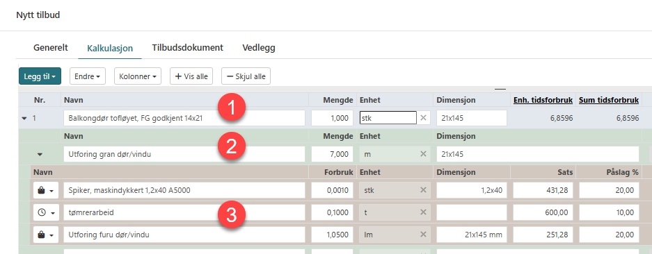 Når et tomt element velges er dette å betrakte som en gruppering som består av poster og ressurser. Dvs at at det er mulig å benytte prisbasen (krever lisens) eller lage egne elementer som f.eks balkongdør. For å sette inn denne må det bygges opp slik: