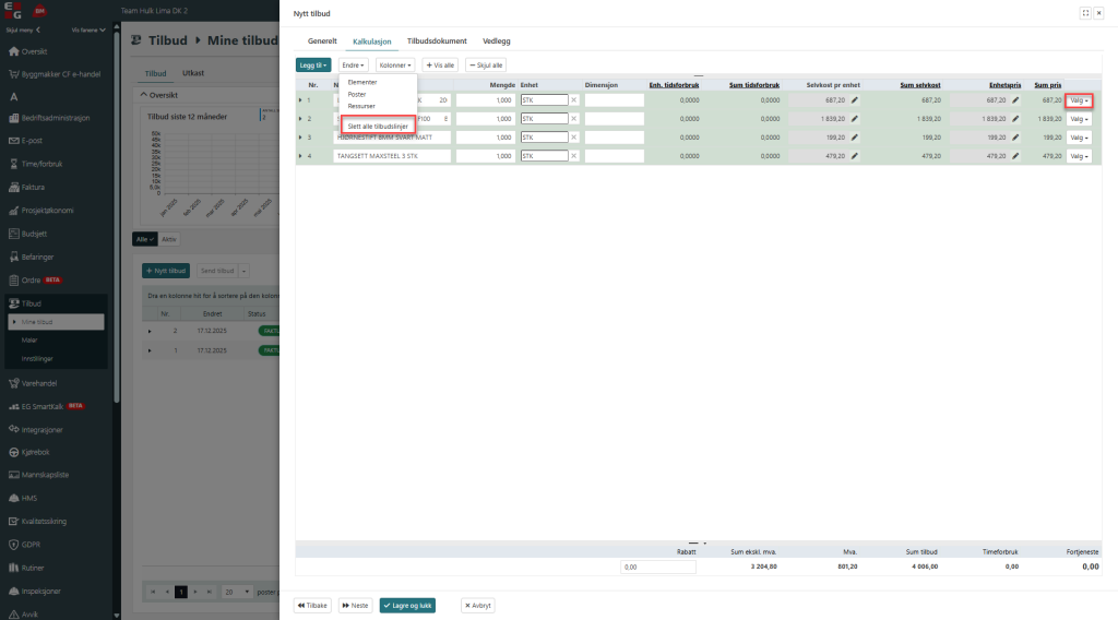 Noen ganger er det behov for å starte på nytt, da kan denne funksjonen være fin å vite om. Gå til endre og velg slett alle tilbudslinjer. Hvis det er behov for å slette kun en linje, gjøres det under «valg»