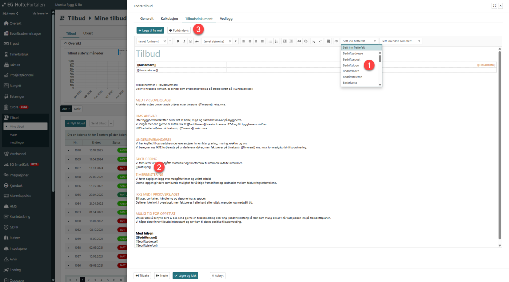 Programmet kommer med tilbudsmaler. Disse kan kopieres og ny tekst kan lages til gitt formål. Når et tilbudsdokument skal benyttes, velges det fra tilbudsmalene. Deretter er det mulig å benytte det vi kaller flettefelt. På denne måten kan tilbudet skreddersys slik det er ønskelig. For å se hvordan tilbudet blir, kan forhåndsvis benyttes før tilbudet sendes til kunde.