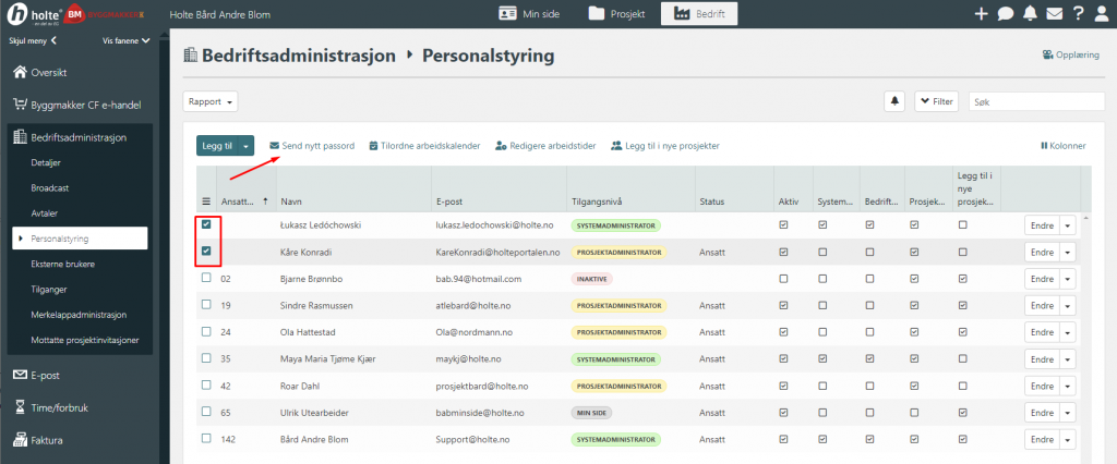 Dersom du ønsker å endre passordet for flere brukere samtidig kan du markere de aktuelle brukerene i listen, også klikke «Send nytt passord». De avhukede brukerene vil da få en e-post med et autogenerert passord fra systemet.