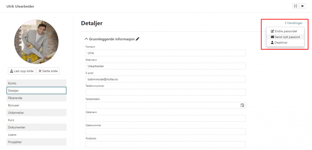 Dersom det bare er en bruker du skal endre passordet for kan du enten gjøre det på samme fremgangsmåte som over, eller klikke på «Endre» knappen ute til høyre. I det nye sidepanelet som åpnes klikker du på «Handlinger» øverst til høyre og velger «Send nytt passord» som vil sende et autogenerert passord, eller «Endre passordet» hvis du eller brukeren selv vil skrive inn et nytt passord.