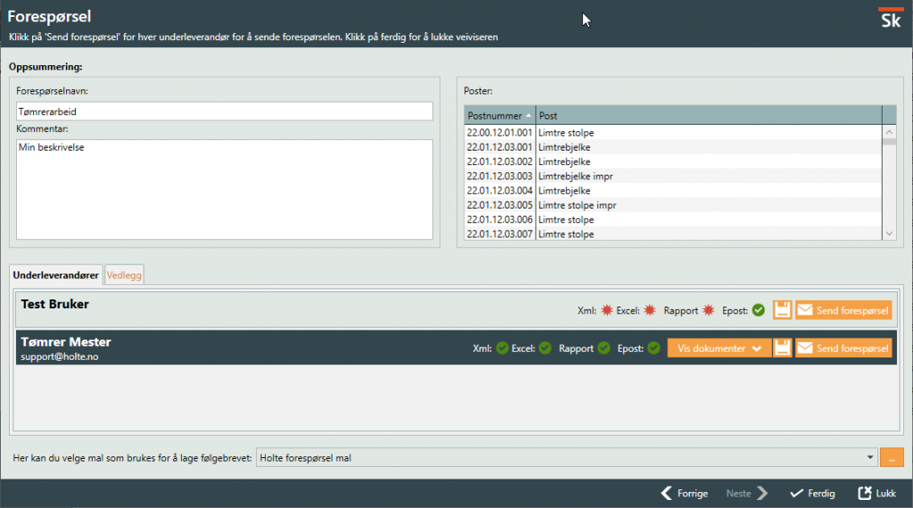 Siste steg i veiviseren viser en oppsummering og aksjonen for utsendelse til valgte underleverandører. Du også her redigere kommentaren før du sender ut. Listen på høyre side viser alle postene som er med forespørselen. Under fanen vedlegg kan du legge til filer som skal følge med prisforespørselen. Vedlegg som blir lagt til blir listet i følgebrevet. Du kan enten bruke Holte sin mal for følgebrev eller du kan trykke på knappen med de tre prikkene for å lage ditt eget følgebrev. Når du er klar til å sende klikker du «Send forespørsel» eller alternativt på lagre knappen for kun å lagre filene til en mappe. Ved klikk på send forespørsel vil du få opp følgebrevet med mulighet for å redigere før får send e-post dialogen hvor alle filer er vedlagt.