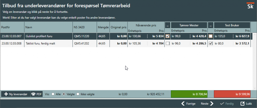Gå videre i veiviseren for å se underleverandørenes pristilbud opp i mot hverandre post for post. Bildet under viser dette steget. I bunnen ser du kjapt hvem som er billigst uten at det trenger å være avgjørende. Dersom du har fått tilbud som ikke er levert elektronisk kan du nå skrive inn tilbudet fra de leverandørene som ikke har levert elektronisk. For å taste inn verdiene manuelt, klikk på […] for den underleverandøren du skal legge inn for. For å velge\akseptere tilbudet fra en av leverandørene klikker du på firmanavnet og hele kolonnen blir markert. Hvis du vil kan du nå også plukke poster fra forskjellige underleverandører. Når valget er tatt for hvilke priser du skal hente inn gå videre i veiviseren.