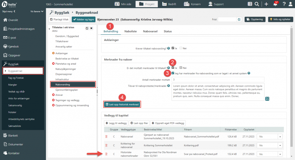 - Åpne behandlingsfanen i kapittelet Nabovarsling.