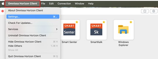 Trykk på «Omnissa Horizon Client» oppe til venstre og velg «Innstillinger»/»Settings»