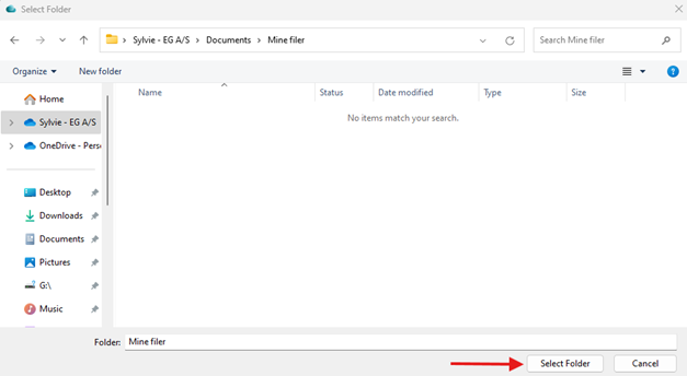 Finn frem til mappen(e) du ønsker å ha tilgang til fra Holte.online og klikk «Select Folder»