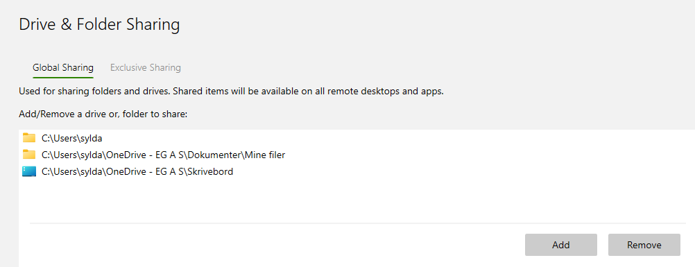 Mappen du delte legger seg i listen over «delte mapper». Hvis du vil legge til flere klikker du «Add» igjen.
