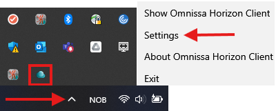 Høyreklikk på ikonet til Omnissa Horizon Client som du finner nede på oppgavelinjen, klikk på Settings.