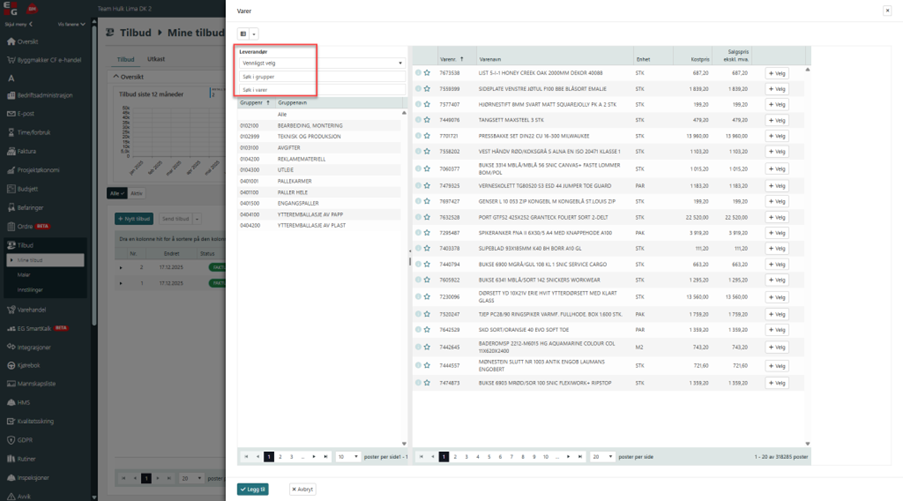 Velg leverandør først, deretter søk i grupper og/- eller i varer, som under. Deretter trykk velg for å legge til varer. Disse legges i en handlekurv. For å overføre dette som tilbudslinjer, klikk legg til nederst til venstre.