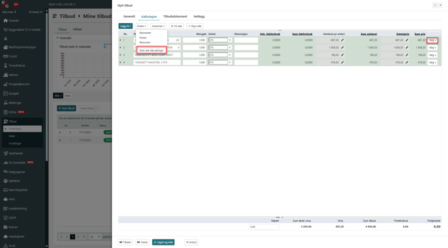 Noen ganger er det behov for å starte på nytt, da kan denne funksjonen være fin å vite om. Gå til endre og velg slett alle tilbudslinjer. Hvis det er behov for å slette kun en linje, gjøres det under «valg»