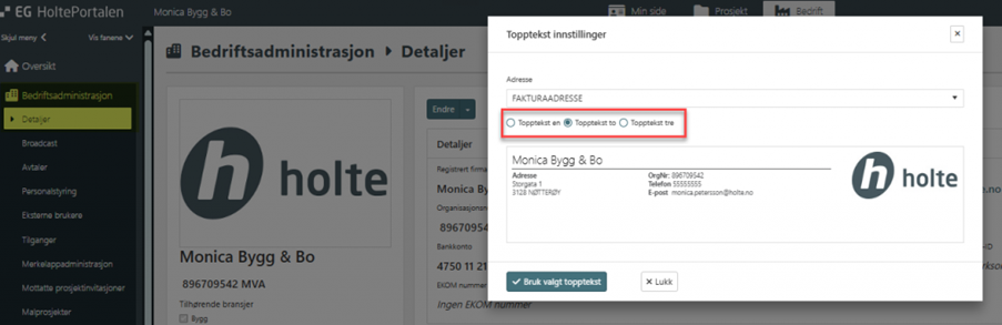Innstilling for topptekst: Denne bestemmer hvordan tilbudshodet skal se ut: