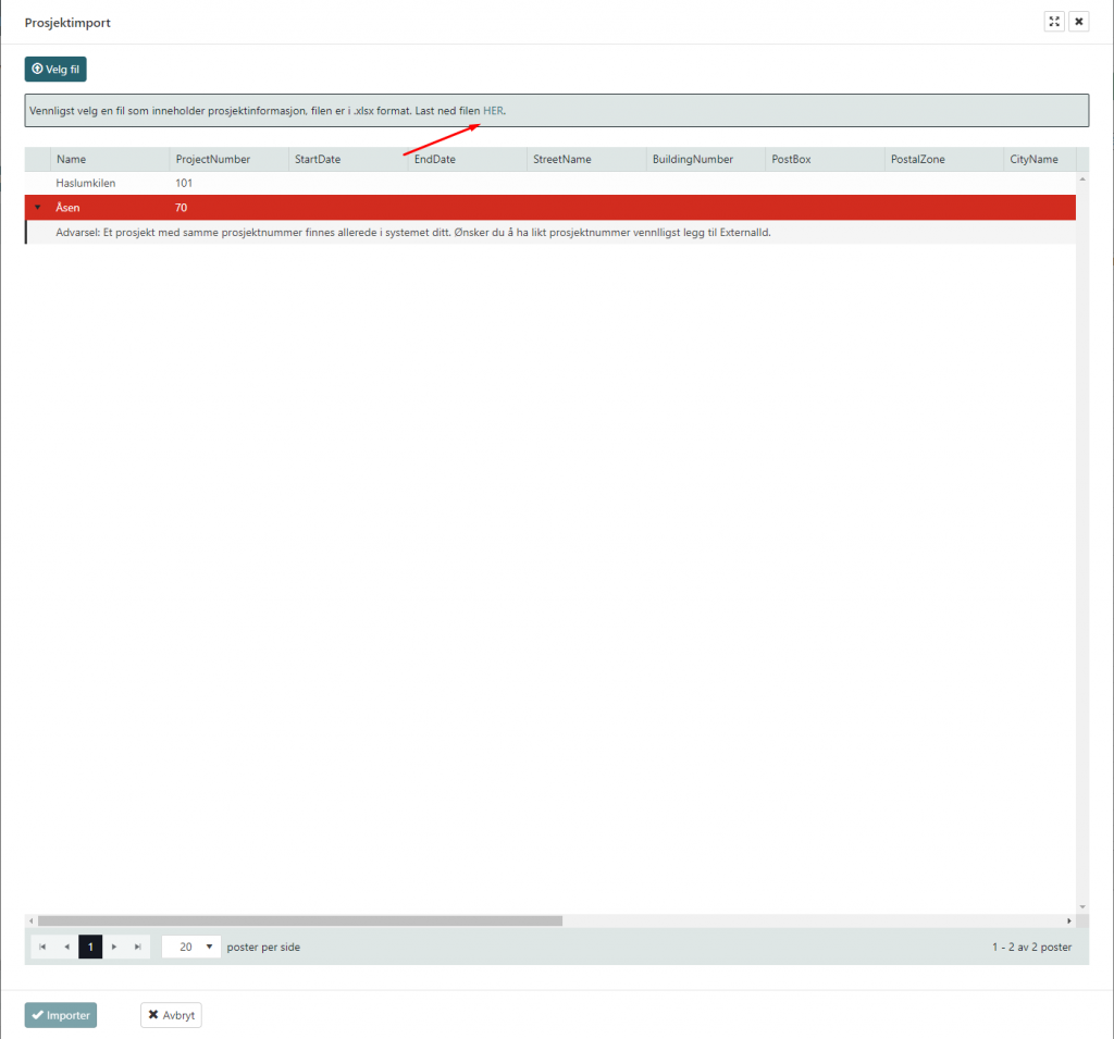 Du kan importere prosjekter ved hjelp av en .xlsx fil (Excel). Er det rett format på denne filen du kunne importere den og de prosektene som ligger i denne filen vil automatisk opprettes i systemet. (Merk at denne importen kan ta noe tid dersom du importerer mange prosjekter)