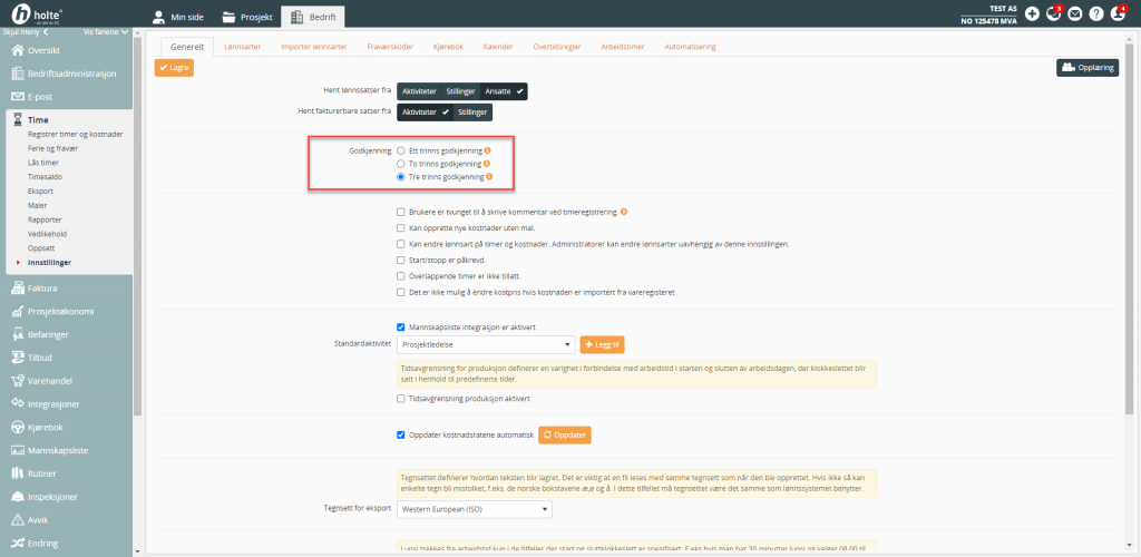 Tre trinns godkjenning: med denne innstillingen setter ansatte timer og kostnader klare for godkjenning. Prosjektleder/Bas/Formann har mulighet til å godkjenne timer han/hun er ansvarlig for. En tredje person kan låse timer. Selv om denne innstillingen er på, er det fullt mulig å låse timer, uten at de er godkjent.