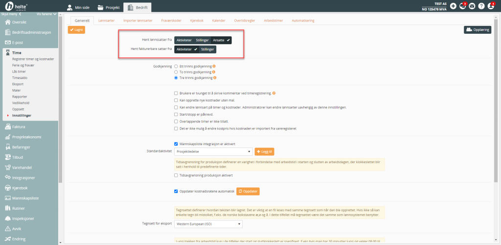- Ansatte, dersom denne er valgt, henter systemet lønnssats fra hver person, dvs at alle kan ha ulik avlønning selv om ansatte har samme stilling eller fører på samme aktivitet. Denne innstillingen er godt eget dersom det er behov for å ha med timepris i eksport fil til lønn, samt ha god kontroll på økonomien i prosjektene.