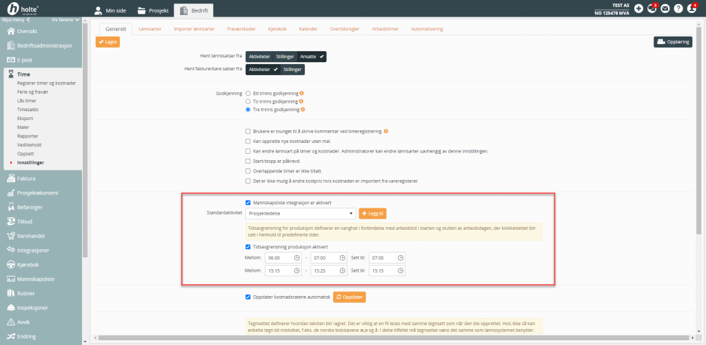 Er mannskapsliste integrasjon aktivert, får du mulighet til å legge til en standard aktivitet fra aktivitetsmalene. Det aktiviteten som settes som standard her, vil være gjeldende for timer som blir overført fra mannskapslisten til Holte Time. Det er mulig å overstyre dette på selve timeføringen, eller pr prosjekt. Gå da til prosjekt fanen – time – innstilling – mannskapsliste.