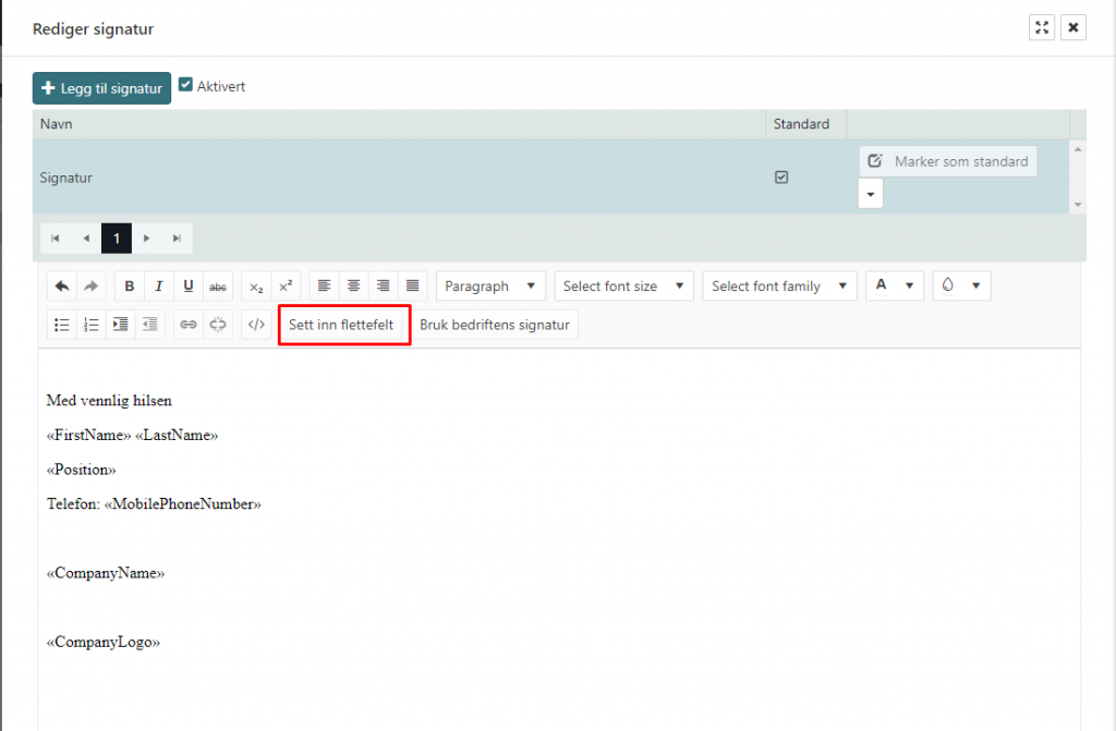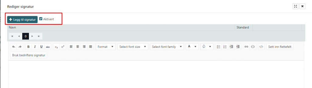 - Har bedriften laget en standardsignatur kan denne arves ved å trykke på «Bruk bedriftens signatur».