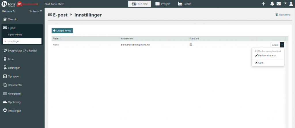 Inne på «Min side – E-post – Innstillinger» har du mulighet for å legge til nye e-post kontoer, se eget tema for hvordan du gjør dette. Du kan også endre innstillinger eller slette de tilknyttede e-post kontoene dine. Du kan sette opp signatur(er) og markere en konto som din standard konto. Det er standard kontoen som vil åpnes hver gang du går inn i epost, og det er kontoen som er satt som standard vi vil foreslå for deg når du skal sende en mail fra systemet.