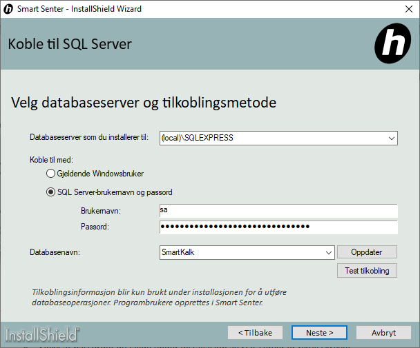 Startside hjelpesenter » SmartKalk » Installer og koble til eksisterende SQL server