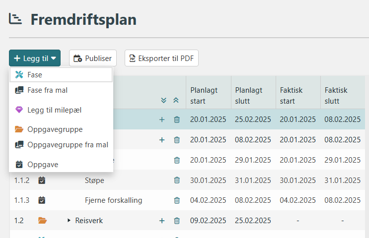 Når du har laget en plan og det er bestemt når arbeidet skal starte kan du tilgjengeliggjøre oppgavene for utførelse via publiseringsfunksjonen. Før en oppgave er publisert er den skjult fra alle andre steder enn i fremdriftsplanen.