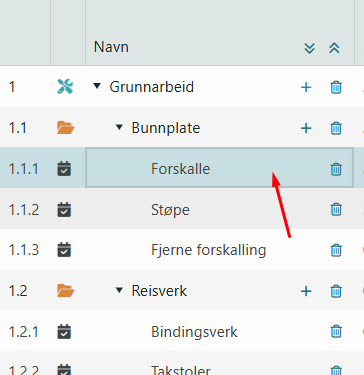 Listen på venstre side er en typisk trestruktur så du kan gruppere oppgaver og grupper inn i faser, du kan også her benytte deg av klikk og dra funksjonaltiet for å redigere trestrukturen slik du måtte ønske for å få visualisert planen din effektivt.
