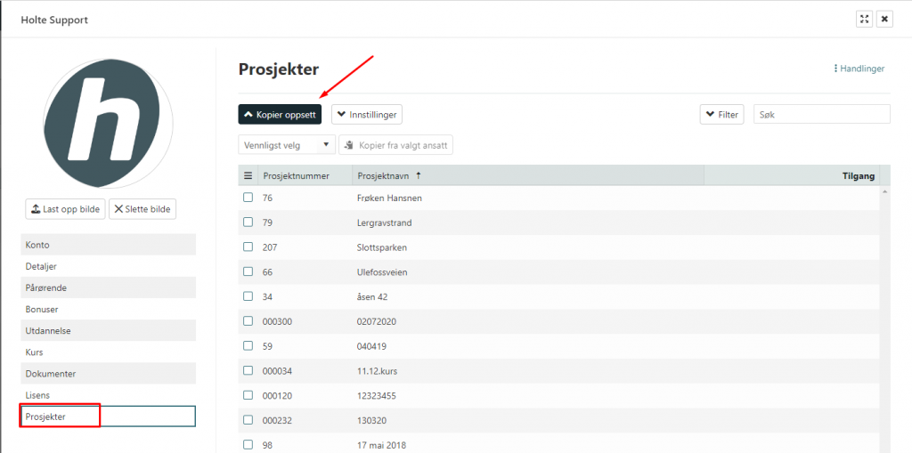 Etter at en bruker er registrert kan du laste opp et profilbilde for brukeren, dette bildet vil brukt rundt om i systemet og i apppen. Du kan også enkelt registrer flere detaljer under fanen «Detaljer» , legge inn relevante kurs, utdannelse eller dokumenter for den aktuelle brukeren. Hvis du vet hvilke prosjekter denne brukeren skal jobbe i kan du fra fanen «Prosjekter» manuelt velge hvilke prosjekter brukeren skal få tilgang til, eller kopiere oppsettet fra en annen ansatt.