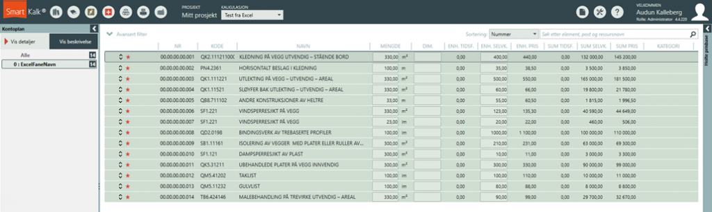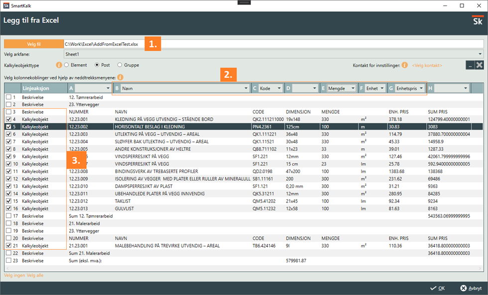 Hvis du mottar en Excel-fil som skal prises kan du bruke SmartKalk og funksjonen «Legg til fra Excel». Funksjonen lar deg enkelt opprette kalkulasjonsobjekter fra rader i Excelfilen med mulighet for å skrive tilbake kalkulert pris og eventuelt CO2e, (se mer om CO2e under klimagassregnskap).