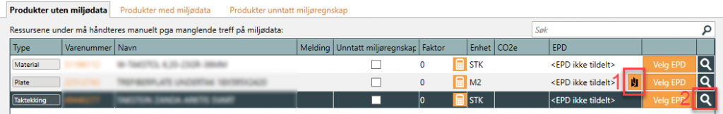 Der det ikke blir innhentet miljødata automatisk må du legge til miljødata selv i eget EPD-register eller se om det finnes et alternativt produkt som har. Sistnevnte gjør du enkelt ved å klikke på søkeknappen som vist i bildet under, (punkt 2). Dersom det vises et PDF-ikon, se punkt 1 i bildet under, indikerer dette at det ligger en EPD som PDF i NOBB. Trykk på knappen for å vise denne PDF’en direkte. Du kan bruke denne til å legge inn en EPD manuelt i ditt EPD-register, (eller eventuelt ta kontakt med produsent\leverandør og hør om de kan legge den direkte inn i NOBB). Merk! Du kan gjøre et forsøkt på å søke etter EPD’en i EcoPlatform, som vil kunne gi deg EPD’er som er registert hos EPD-Norge.