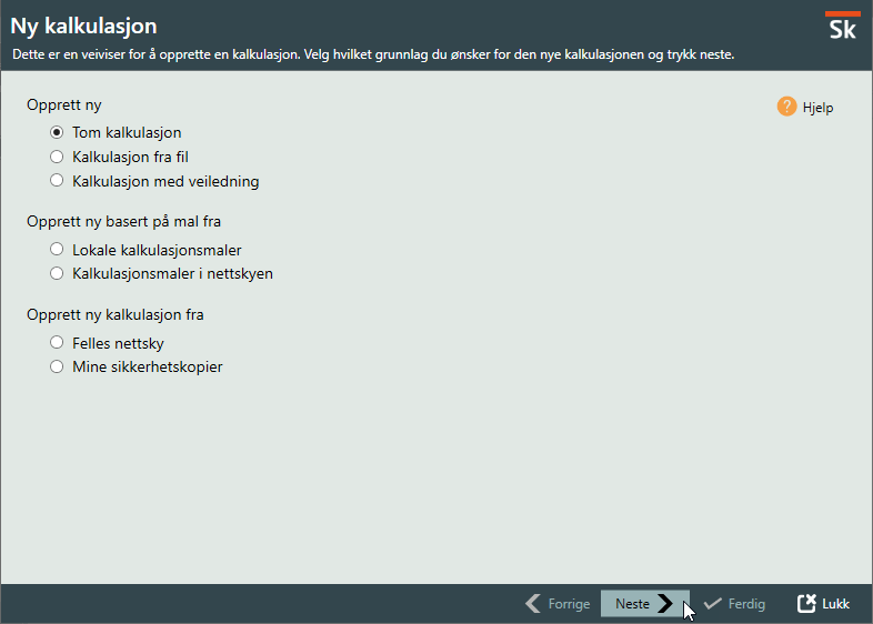 Dialogen for ny kalkualsjon vil gi det noen valg for hvilket grunnlag du ønsker å starte med. Se forklaring under til de ulike valgene.
