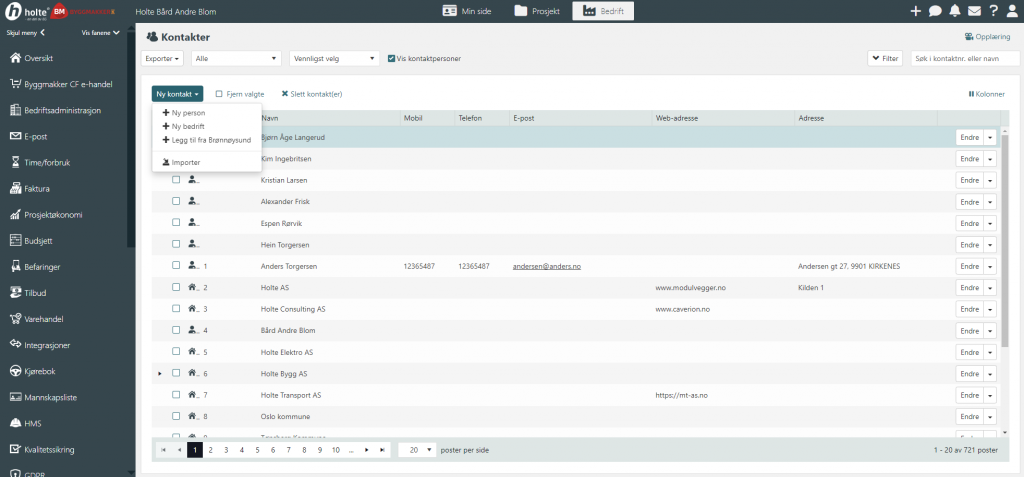 Velg «Ny kontakt» for å få opp valg for opprettelse av en ny kontakt. Du kan velge mellom «Ny person» og «Ny bedrift». Ønsker du å legge til en «Ny bedrift» kan du velge å legge inn informasjon selv, eller «Legg til fra Brønnøysund» som henter all informasjon fra Brønnøysundregisterene.