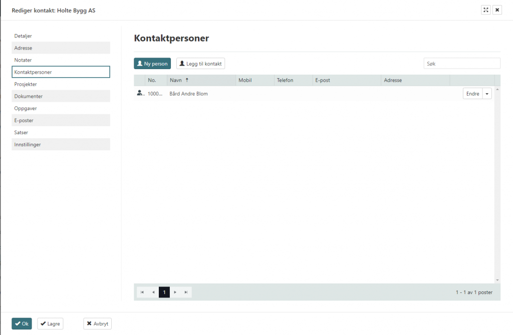 • På en opprettet bedriftskontakt kan du under menyvalget «Kontaktpersoner» legge til personkontakter som blir knyttet mot denne bedriftskontakten