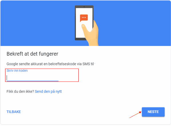 10. Du vil få en sms med en kode eller en telefonsamtale med en kode alt etter hva du valgte i forrige steg. Skriv inn denne koden og trykk neste