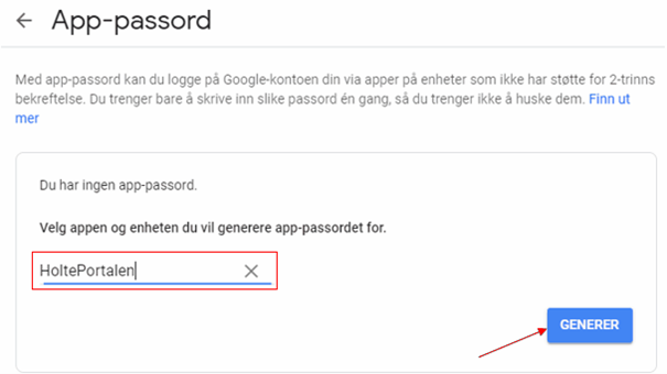 For å bruke Gmail inn i Holteportalen må du sette opp dette inne i google kontoen din. Dette gjøres ved å bruke en 2 stegs verifisering og gi HoltePortalen tilgang til å vise eposter fra din Gmail. Helt eksakt lager du et eget passord til koblingen mellom HoltePortalen og Gmailen din slik at du ikke trenger å bruke Gmail passordet når du setter opp denne koblingen.