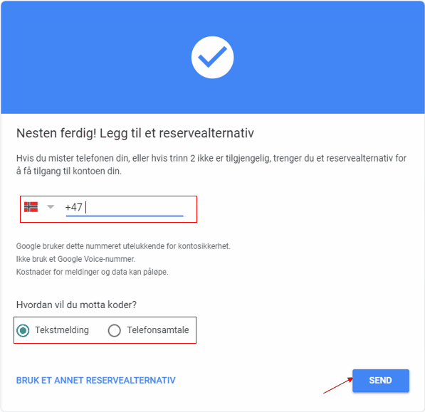 9. Velg et reservealternativ ved å fylle inn telefonnummeret ditt og velg enten motta sms eller en talemelding