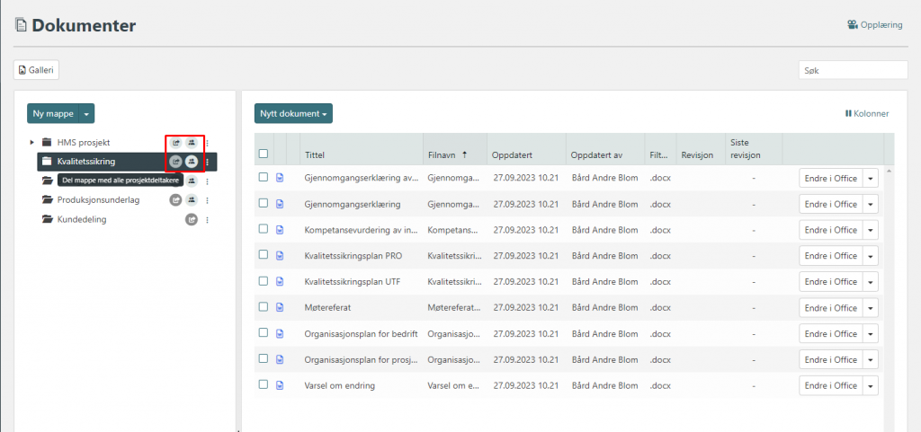 Når det opprettes en mappe i dokumentregisteret er den i utgangspunktet en intern mappe. Det vil si at det kun er prosjektadministrasjonen i prosjektet som vil ha denne mappen tilgjengelig i prosjektområdet. Ønsker du å dele innholdet i en mappe med prosjektdeltagerene eller eksterne deltagere kan du enkelt gjøre dette ved å trykke på knappene til høyre for mappen. (Se markerte knapper i bildet over)