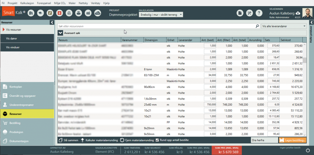 Ressursfanen i menyen på venstre side i programmet får du en god oversikt over alle ressurser som er i bruk i kalkulasjonen. Søk enkelt i listen ved å bruke søkefeltet på toppen eller ekspander «Avansert søk» for flere søkemuligheter. Under «Avansert søk» kan du blant annet filtrere listen i henhold til kategorier du har merket ressursene dine med.