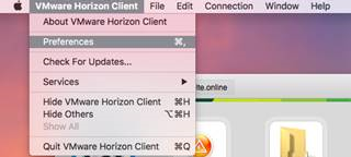 - Velg WMware Horizon Client oppe til venstre og velg Preferences