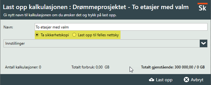 Med dette valget blir kalkulasjonen lagret til nettskyen, men det er kun de som er koblet til samme database som deg som vil kunne hente den ned igjen fra nettskyen.- En sikkerhetskopi brukes igjen ved Ny kalkulasjon og valget opprett ny kalkulasjon fra «Mine sikkerhetskopier».
