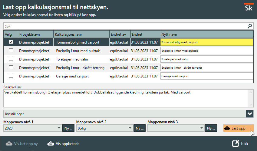 - I dialogen som nå vises vil du se kalkulasjonene som finnes i prosjektet du har åpent. Disse kan du nå laste opp og dele som maler.