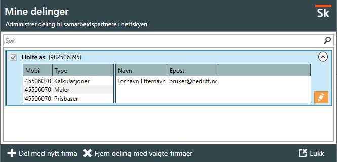 - For å lage en deling med en samarbeidspartner trykker du på knappen «Del med nytt firma».
