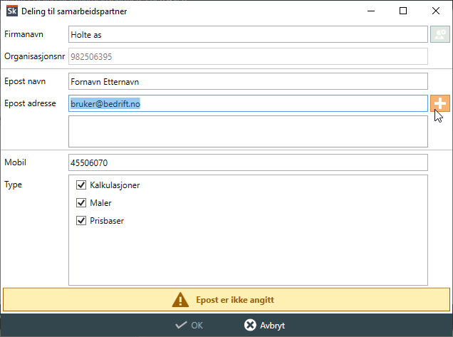 - Organisasjonsnummer må oppgis for at deling skal kunne settes opp.