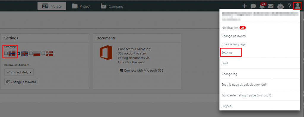 Hvis du opplever problemer med språk i Holteportalen, om det er Engelsk eller en miks av Norsk og Engelsk. Ikke får tatt rapporter, eller Byggsøk har forsvunnet. Klikk på profil ikonet oppe til høyre, velg «Settings», huk av for Norsk språk.
