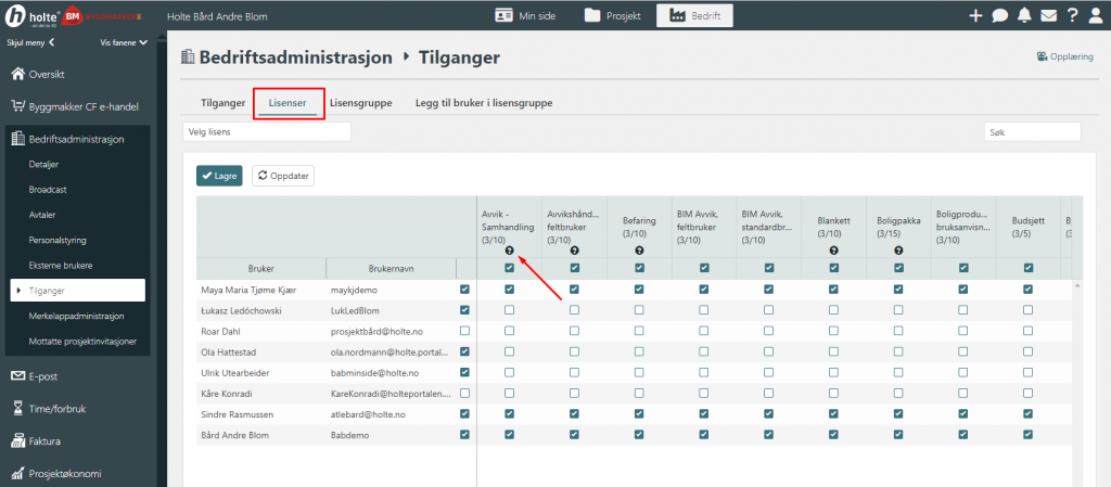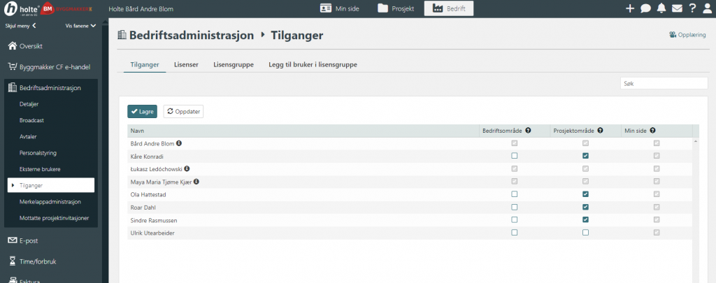Her settes det opp hvilke moduler de enkelte brukerene skal ha tilgang til.