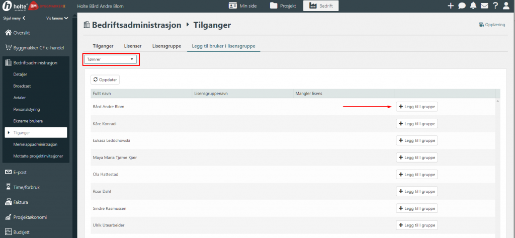 For å legge brukere til en lisensguppe må du først velge gruppen i nedtrekksmenyen i toppen. Deretter trykke på legg til i gruppe på de brukerne du ønsker.